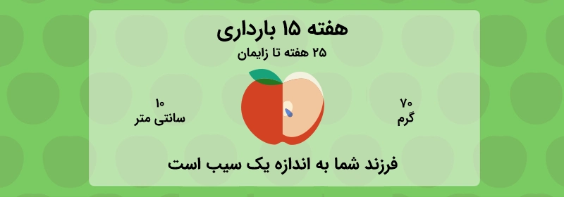 در هفته پانزدهم بارداری، جنین به اندازه یک سیب است. وزن جنین حدودا 70 گرم و اندازه او 10 سانتی متر است و تناسب اندام جنین در حال طبیعی تر شدن است، زیرا پاهای او اکنون از بازوهای او بزرگتر است.