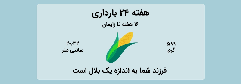 در این هفته جنین به اندازه یک بلال است. جنین تقریباً 30 سانتی متر قد و 590 گرم وزن دارد.